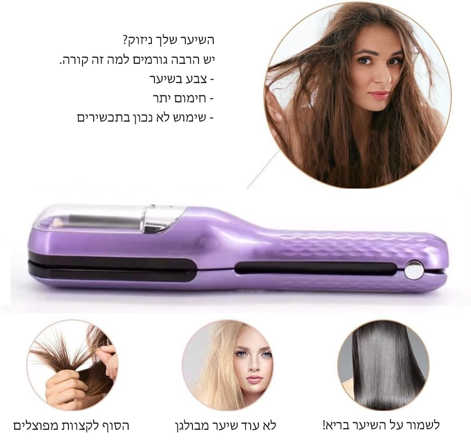 🔹 גוזם קצוות מפוצלים ומשאיר את השיער חלק ובריא